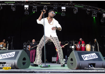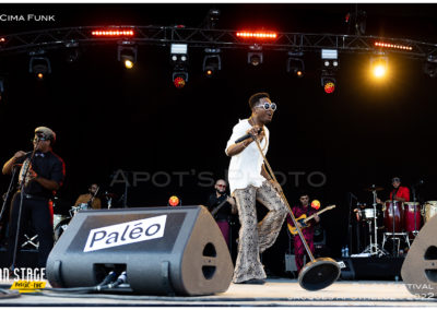 Si vous aviez un p’tit coup de blues, besoin de vous remonter le moral, il ne fallait pas louper Cimafunk à la scène Véga. Derrière ces grosses lunettes de soleil blanche, sorti tout droit des année 70, il allie la musique afro-cubaine au funk, et il fait ‘’moover’’, dès les premières mesures, les fans et les festivaliers. Les choristes sont sublimes et ne sont pas que choristes, elles jouent aussi des cuivres. Ça sent bon La Havane.
