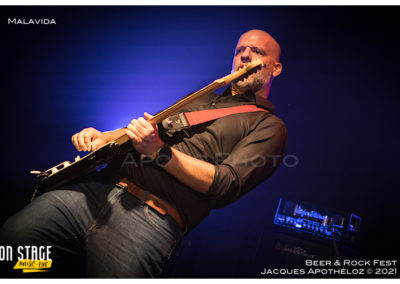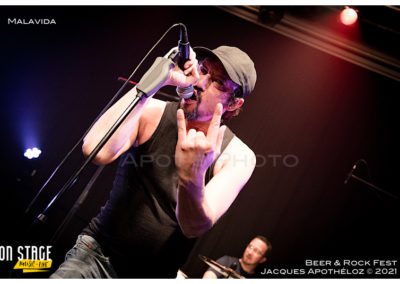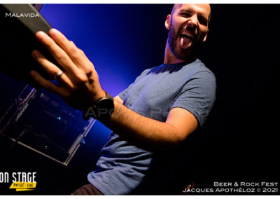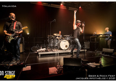 Une bonne demi-heure plus tard et un changement de plateau bien orchestré, Malavida prend place et nous sert un power rock accrocheur. Le charisme du chanteur nous tient par ses textes, tandis que les harmonies l’accompagnent à merveilles avec de bonnes pointes de riffs bien agressives.