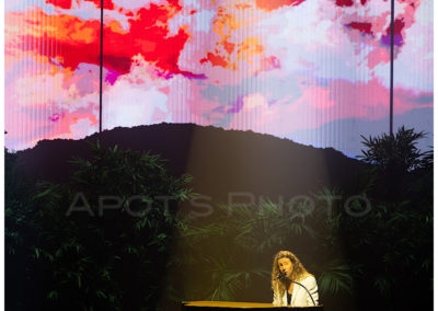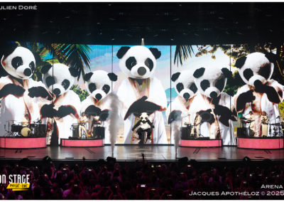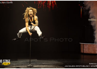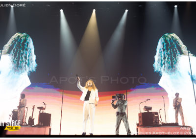 20h40, il est l’heure pour Julien Doré de faire son entrée dans une salle bien pleine ! (env. 7’000 personnes) Son concert, Golden Club commence. Un mur lumineux doré s’ouvre pour faire place aux musiciens. Quand soudain … oups … Julien Doré apparaît par le plancher… comme par magie ! « Ce soir on va se faire du bien ». En véritable showman, le visuel fait partie du show et accompagne de façon spectaculaire ses chansons et ses textes. Quel spectacle ! Ses tubes et ses dernières chansons sont bien connus du public. Il joue de sa personne et rassemble son public, qui le lui rend bien ! « Merci pour cet amour qui flotte ! » Ce mec est dingue … quel artiste ! Merci pour la folie et merci pour les photographes qui ont eu le droit de shooter tout le concert.