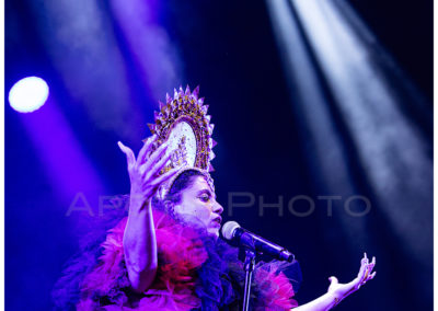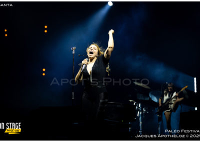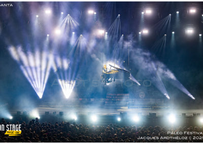22h45, « Paléo, Paléooooo … ». L’arrivée de la chanteuse Santa n’est pas banale. Elle est tirée depuis le haut de la scène, attachée à des sangles, la tête en bas ! Et c’est dans cette position qu’elle entonne les premières mesures. Quelle voix, quelle présence, quel « peps ». Elle fait le show avec un naturel de fou. Mélanger « Le Paradis Blanc » et « Désenchantée » … spécial, mais pas inintéressant ! Son sourire est contagieux, il est sur tous les visages.