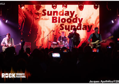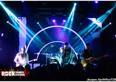 22h10, déjà dernier groupe de la soirée, WE2, The U2 Tribute. Le groupe zurichois recrée l’ambiance, l’énergie du groupe d’origine, tout en respectant, presque notes pour notes, les titres originaux. Dès la deuxième chanson, les fans sont « à donf « Belle complicité entre les artistes, et belle présence scénique du chanteur … on croirait le vrai ! Super show !