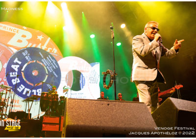 Dernier changement de plateau et c’est déjà, au tour des stars de ska-pop britannique, Madness de faire leur show. Comme pour tous les groupes de la soirée, les tubes s’enchainent, leur côté décalé est toujours bien présent et c’est ce qui a fait leur style. Ça manque un peu de ‘’punch’’ et de dynamisme. Avec la pluie qui s’invite à nouveau, ça n’aide pas ! Dommage pour tous les festivaliers qui se sont habillés comme leur groupe fétiche, la fête retombe un peu !