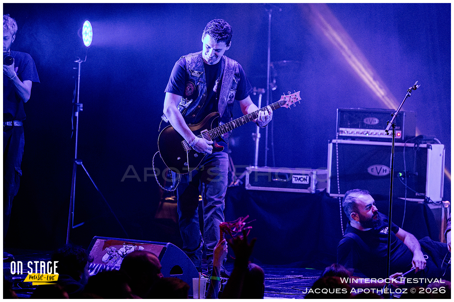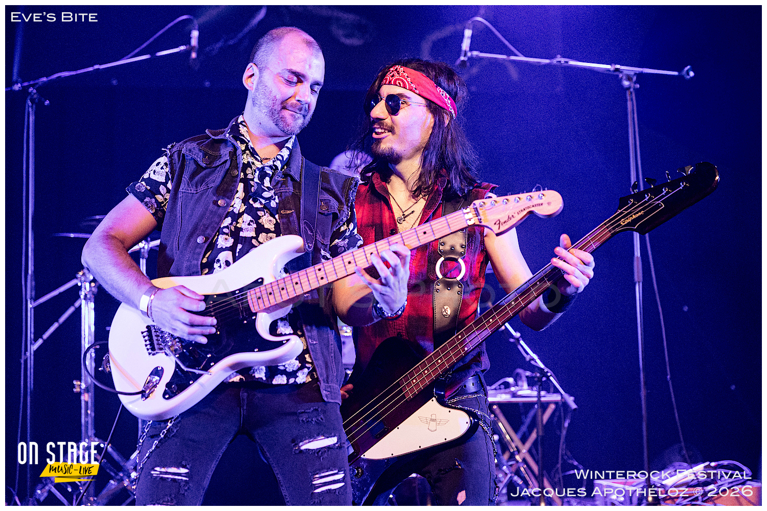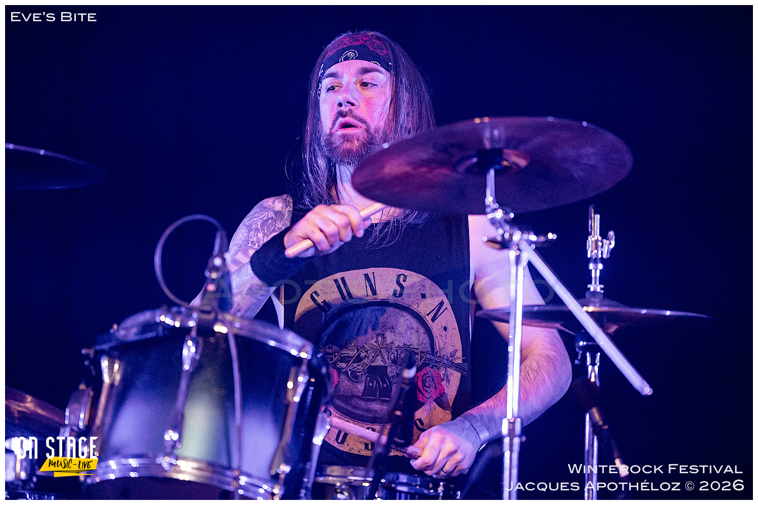 19h30, c’est parti avec les stéphanois, Eve´s Bite. Dès les premières mesures, on y est, c’est du bon heavy metal très mélodieux, avec une voix qui monte bien dans les aigus, accompagné de chœurs à l’arrière, des beaux solos « battle » de guitares. « Vous êtes prêts à foutre le bordel ? Jouez pas les timides ! « Chouette moment, belle découverte et bonne « mise en bouche ! »