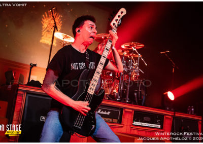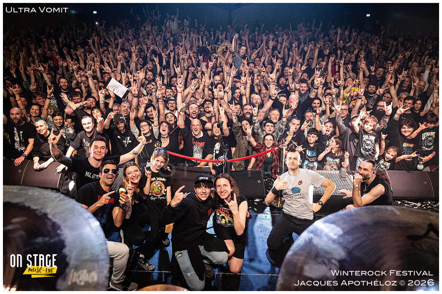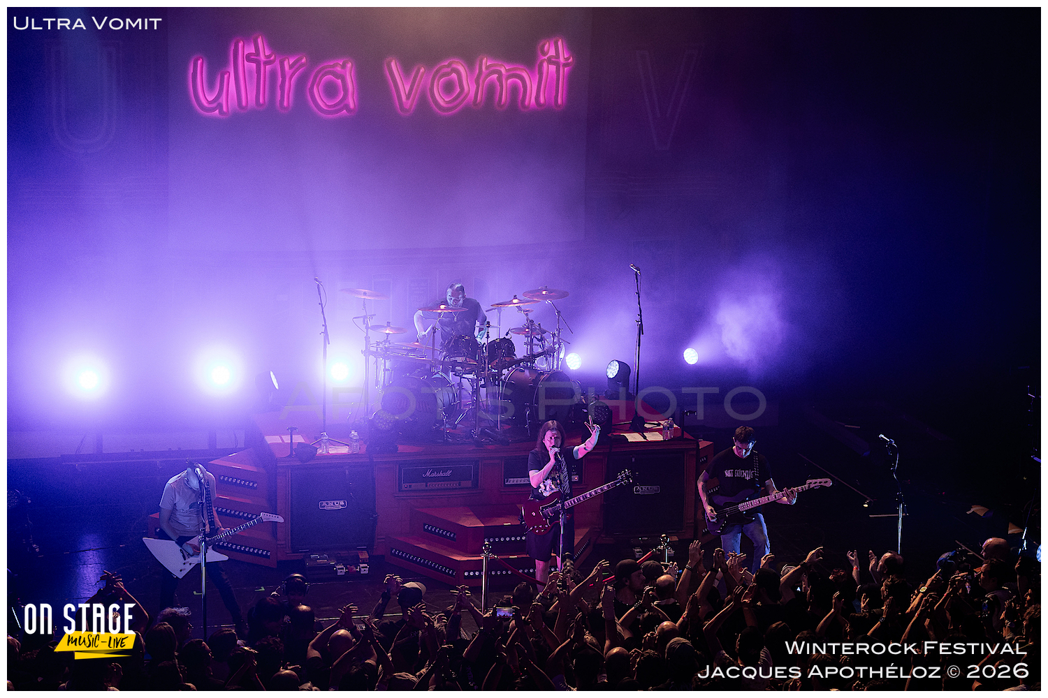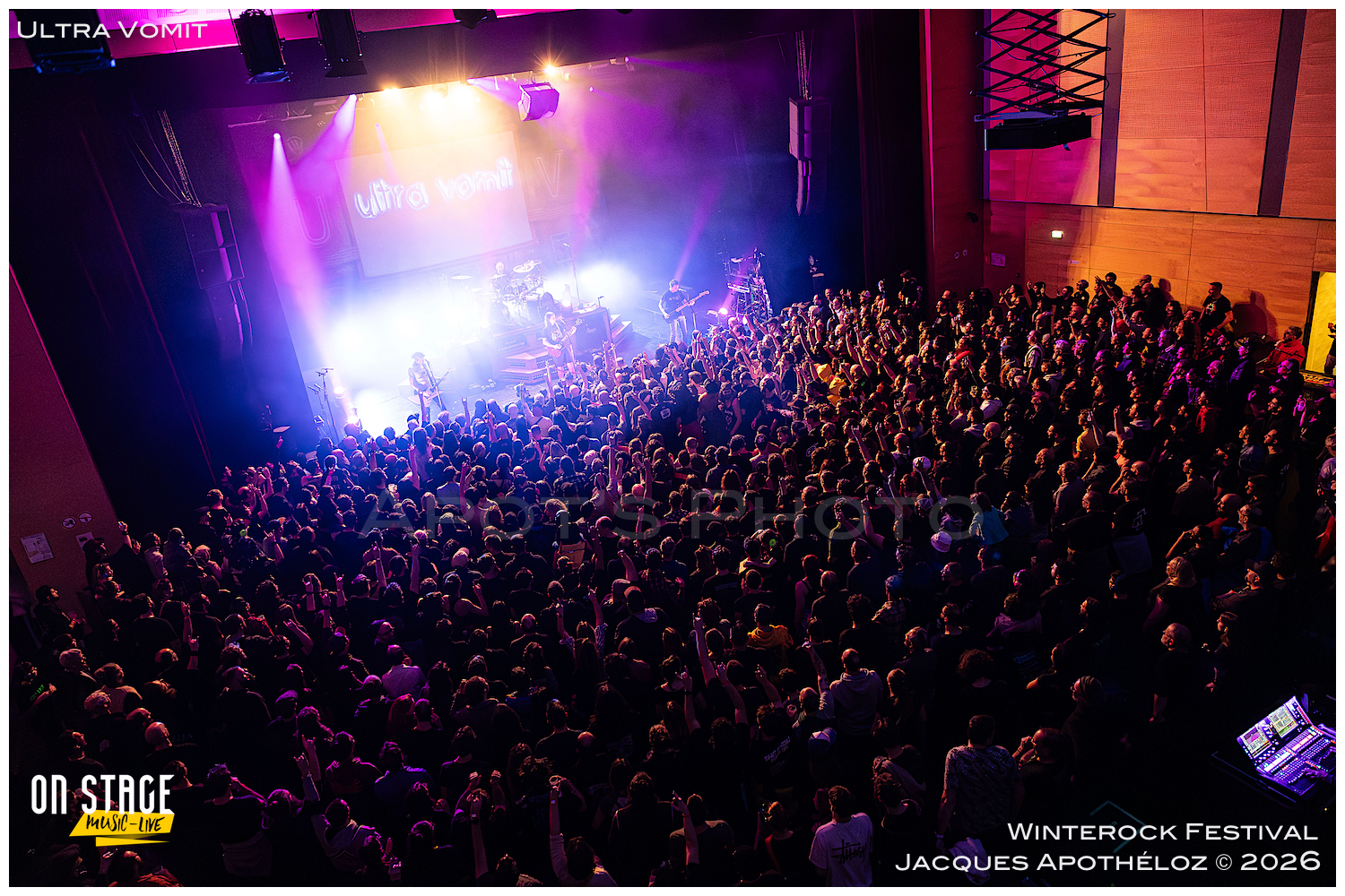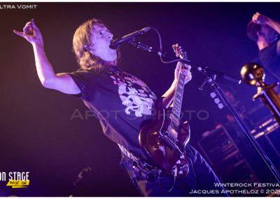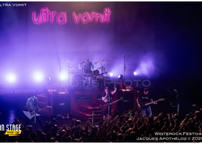 21h15, la soirée continue, et c’est Ultra Vomit qui fait son entrée ! Ces derniers temps, étant abonné à leurs concerts, c’est toujours un plaisir de couvrir leur passage très apprécié du public, grand et petit. La salle de l’Agora est complète, pas moins de 700 personnes ont fait le déplacement pour voir le spectacle. Quand Nico, le chanteur pose la question de qui les a déjà vu et qui ne les a jamais vu, ça ressemble à du 50/50… et au batteur de rétorquer « qui a fait ni l’un ni l’autre ? » On sent bien que la soirée va être rythmée de bons sons et de blagues plus ou moins douteuses… Comme à chaque fois, leurs parodies sont bien faites et le public, fan ou découvreur est conquis.
