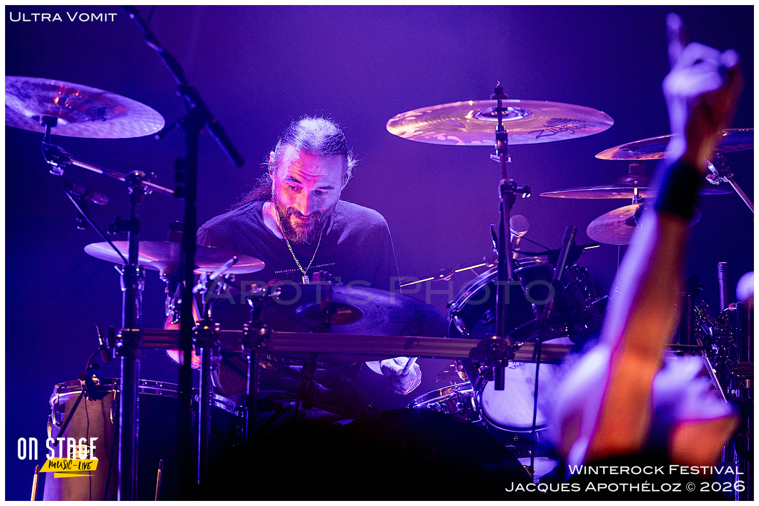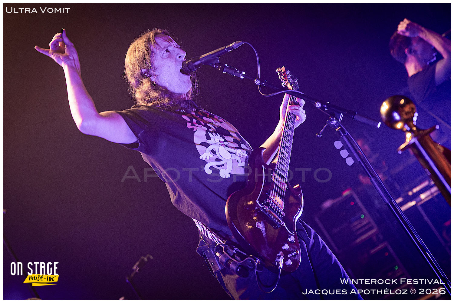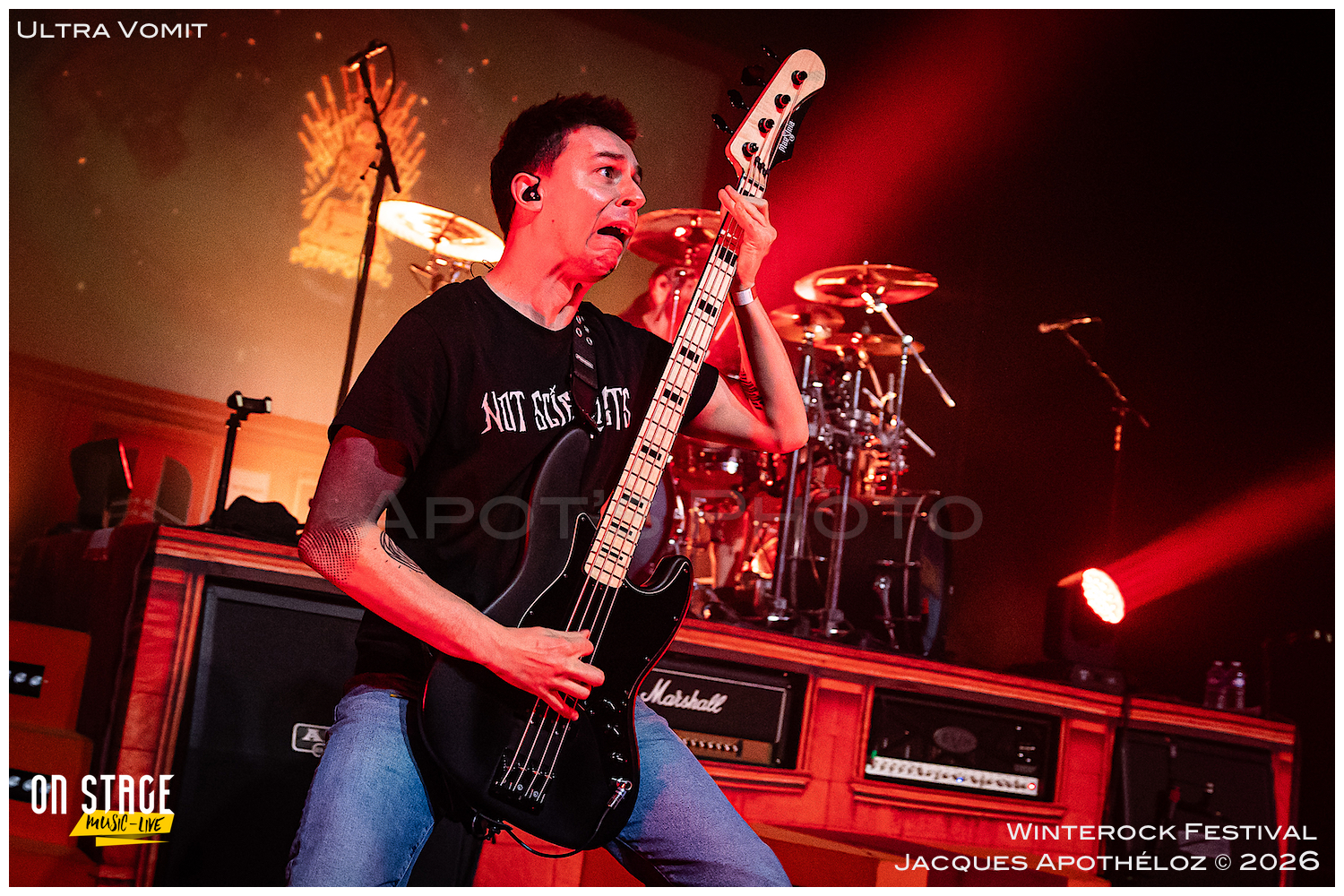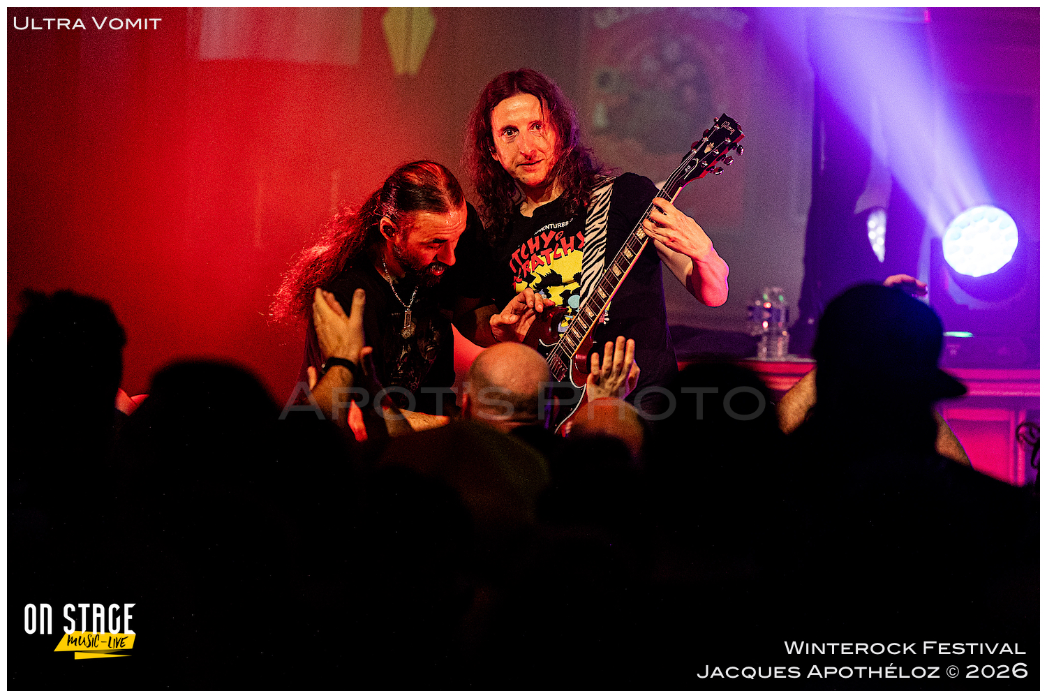 21h15, la soirée continue, et c’est Ultra Vomit qui fait son entrée ! Ces derniers temps, étant abonné à leurs concerts, c’est toujours un plaisir de couvrir leur passage très apprécié du public, grand et petit. La salle de l’Agora est complète, pas moins de 700 personnes ont fait le déplacement pour voir le spectacle. Quand Nico, le chanteur pose la question de qui les a déjà vu et qui ne les a jamais vu, ça ressemble à du 50/50… et au batteur de rétorquer « qui a fait ni l’un ni l’autre ? » On sent bien que la soirée va être rythmée de bons sons et de blagues plus ou moins douteuses… Comme à chaque fois, leurs parodies sont bien faites et le public, fan ou découvreur est conquis.